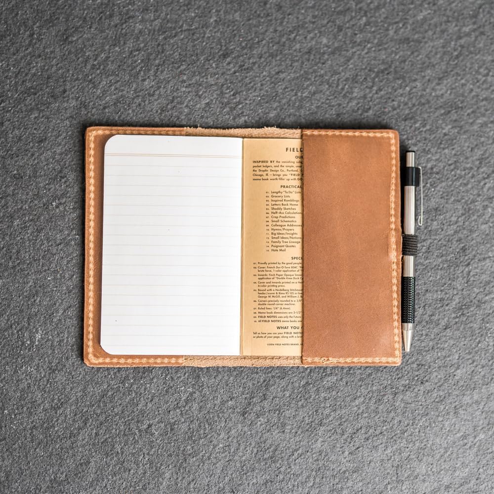 Introducing our Personalized Leather Field Notes Cover - the perfect blend of functionality and style. Made with high-quality leather, it not only holds your field notes but also adds a touch of elegance. With use, the leather develops a beautiful patina, making it truly one-of-a-kind. Upgrade your note-taking experience now!DETAILS:- Cover Size: 3.75" wide x 6" high when closed- Leather Color Options: Choose from Whiskey, Café, Espresso, or Black- Personalization Character Ranges: Choose the range you need from No Personalization, 1 Large Serif Initial, 1 Large Cursive Initial, 2-3 Initials, 4-15 Characters, or 16-25 Characters.- Comes with and holds 1 Field Notes book- Attached elastic pen holder- Made in the USACUSTOMIZATION OPTIONS:- Personalization: Maximum of 25 characters - stamped on the bottom of the field note coverREAL LEATHER: Each product is one-of-a-kind and made from part of a whole hide of leather. There will be unique variation from item to item that truly make it your own. The topside is smooth and finished while the backside contains the grain fibers that indicate a true leather product. We only use the best full-grain leather and highest quality paper, thread, and hardware on each product.