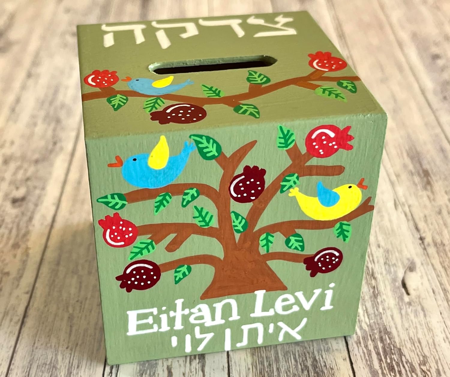Teach the value of giving from an early age with a beautifully handcrafted Tzedakah box. In Jewish tradition, Tzedakah represents charity, justice, and caring for others—making this piece both meaningful and educational. Each wooden Tzedakah box is individually hand painted, personalized with a name, and sealed for protection. Its compact 3-inch size is perfect for little hands, shelves, or nurseries while remaining fully functional with a coin slot and removable bottom stopper. This personalized Tzedakah box makes a thoughtful Jewish baby gift, a special keepsake for birthdays and Bar or Bat Mitzvahs, and a heartfelt Hanukkah present that will be cherished for years to come.