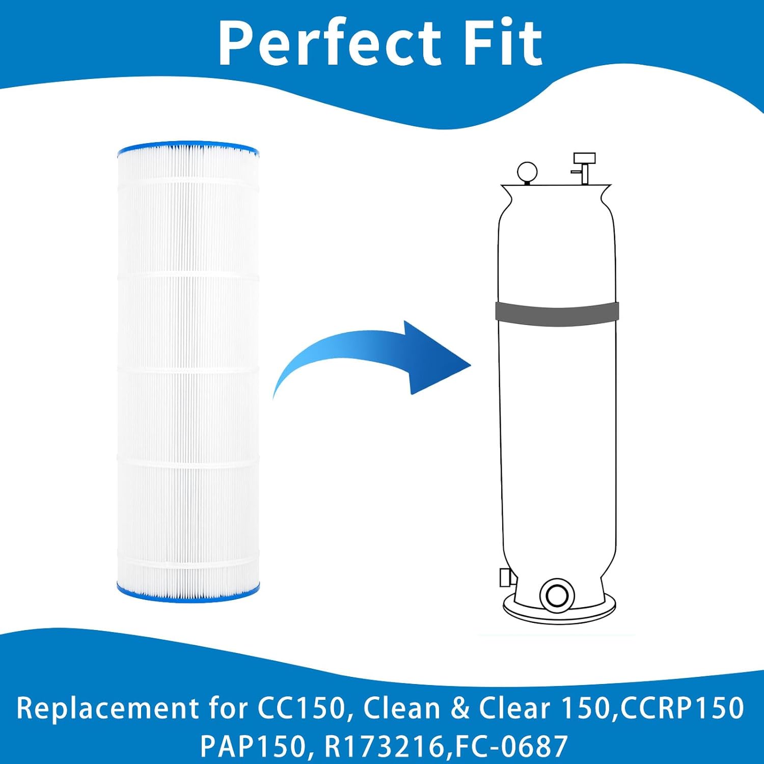Product description:Product packaging quantity:2 pack.Filter area:150 sq.ft.Feature:100% Brand new and high quality.SavenerPLF150A Pool Filter Replaces for C-9415, Filbur FC-0687, CC150, CCRP150, PAP150, R173216, 160317, 160355, 160352, XLS-908, 10150, 150 Sq.Ft Swimming Pool Filter CartridgeSpecifications:Length:31 1/8", outside diameter:10 1/16", top/bottom:6" open, filtration area:150 sq.ft. Filter material: trilobal filtration fabric.Compatible Models:C-9415, Filbur FC-0687, CC150, CCRP150, PAP150, R173216, 160317, 160355, 160352, XLS-908, Ultral-C4, PP-C4, PP-C4-M, 10150.High Efficiency Filtration:Uniformity and high-performance trilobal fabrics have a higher capacity than ordinary bonded fabrics. The trilobal shape of the fabric fibers also helps capture particles, increases efficiency without causing pressure drop loss, and helps reduce the frequency of filter cleaning.Reinforcement Structure:With thickened trilobal fabric, heavy chlorine and break resistant end caps and reinforced center support, the filter provides high power propulsion flow and crystal clear water for your relaxed and healthy enjoyment.Easy Maintenance:We suggest to rinse your spa filters regularly with clean water, this will help remove dirt and protect your filter material. With regular cleaning, the filter also needs to be replaced regularly to make your spa filter work more efficiently.
