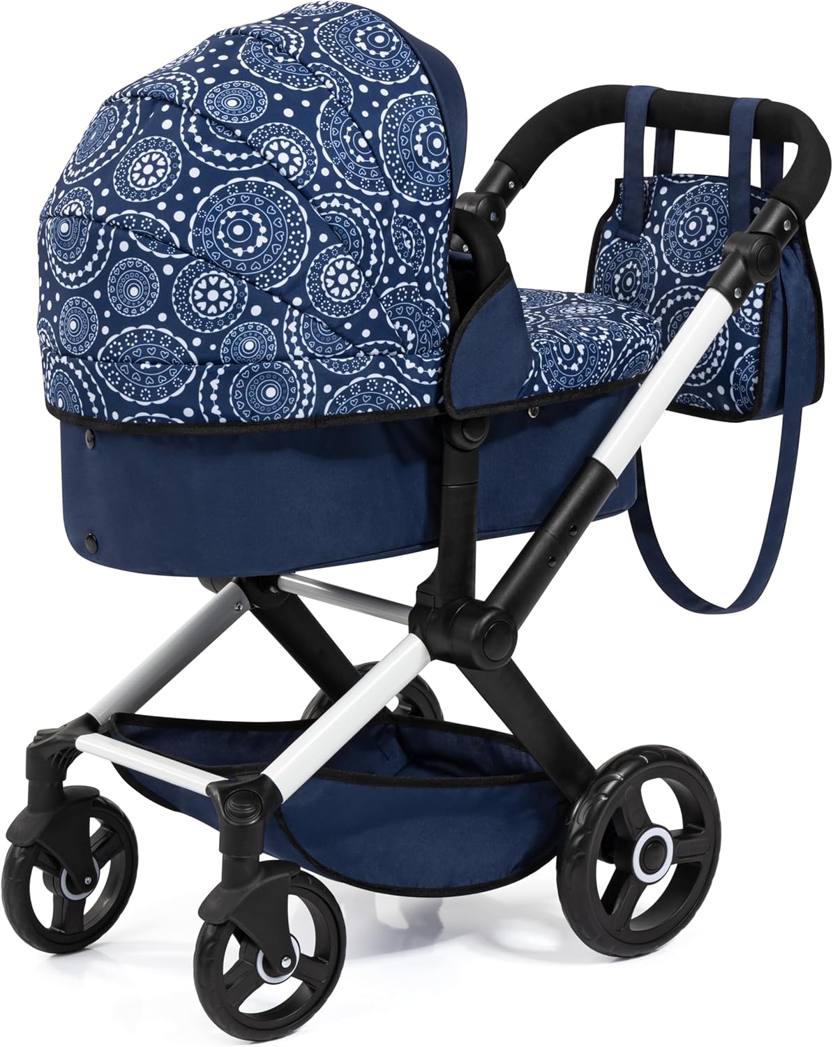 BAYER DESIGN DOLLS: XEO PRAM - BLUE, WHITE, CIRCLES - The combi doll’s pram XEO has a modern design and is suitable for dolls and stuffies up to 18"/46 cm. With its adjustable handle, this doll's pram is easily adaptable to your child's height; also, it's possible to mount the carrycot in direction of travel or towards your child. With the reversible handle a change of the direction is also possible. The doll’s pram can be easily converted to a pushchair with press buttons and with the change of the angle of the carrycot. The carrycot’s cover will either way; if she's sitting or lying in the pram; protect the little doll from sun and wind. The swivel front wheels assure a stable cornering. The accompanying bag has a long handle to be used as a shoulder bag and two short ones as a hand bag. Additionally, it includes a zipper to close the bag safely. For more storage space the integrated shopping basket is also perfect to keep everything stored. INCLUDES: 1 Dolls Pram, 1 Shoulder Bag. Designed for dolls up 18" (46cm) * Doll not included. Suitable for boys and girls ages 3 and up.