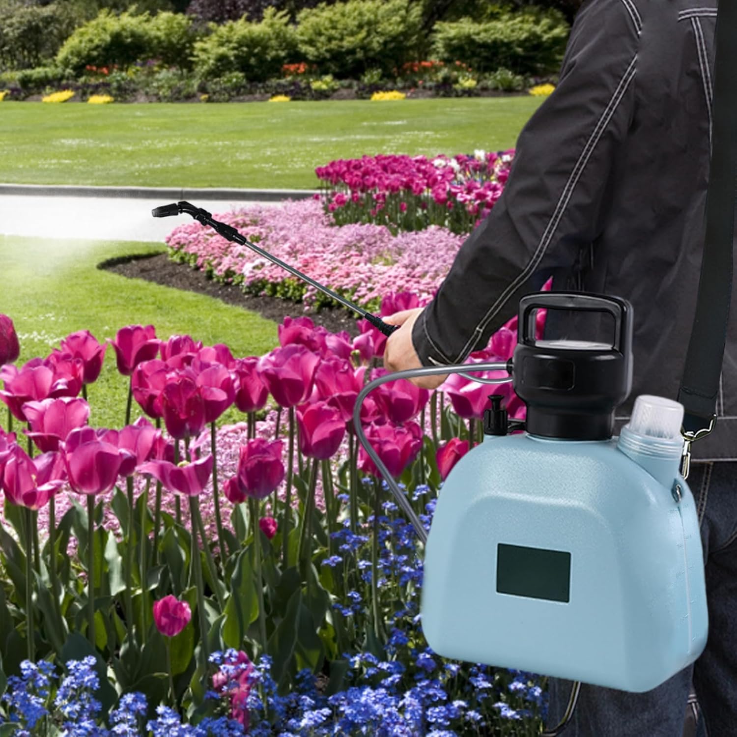 Description: Make short work of watering your plants with the Electric Sprayer 5L Large Capacity Garden Watering Sprayer. This powerful 7.4V pressure sprayer can hold up to 5 liters of water and is designed to a precise, even spray for maximum coverage and efficiency. The ergonomic handle makes it easy to carry and use while the lightweight design helps reduce fatigue. Get the job done quickly with the Electric Sprayer 5L Large Capacity Garden Watering Sprayer. Features:. garden sprayer. -Color: Blue. -Material: Plastic. -Size: 12x27.5x36.5 cm/4.72x10.83x14.37 inch. -Voltage power: 7.4V/6W. -Battery capacity: 2000mAH. -Charging time: about 3 hours. -Usage time: about 2.5 hours. -Capacity: 5L. Note: For manual measurement, please allow slight errors in size. The colors may exist slight differences due to different screens. Package Including 1 * Garden sprayer