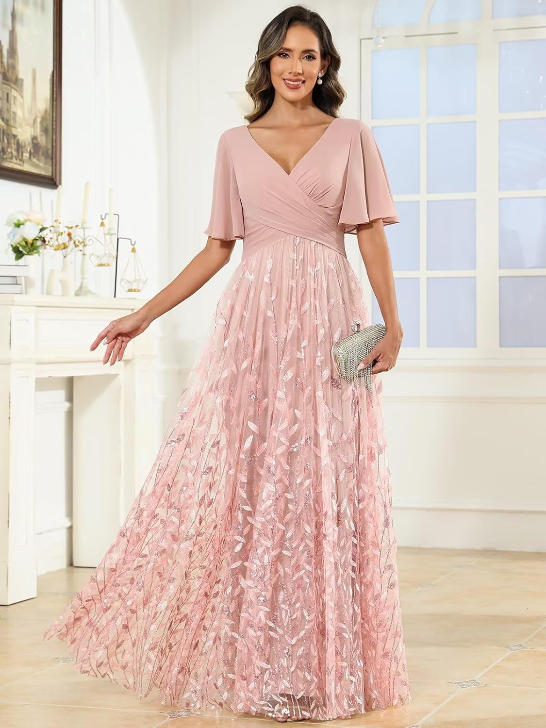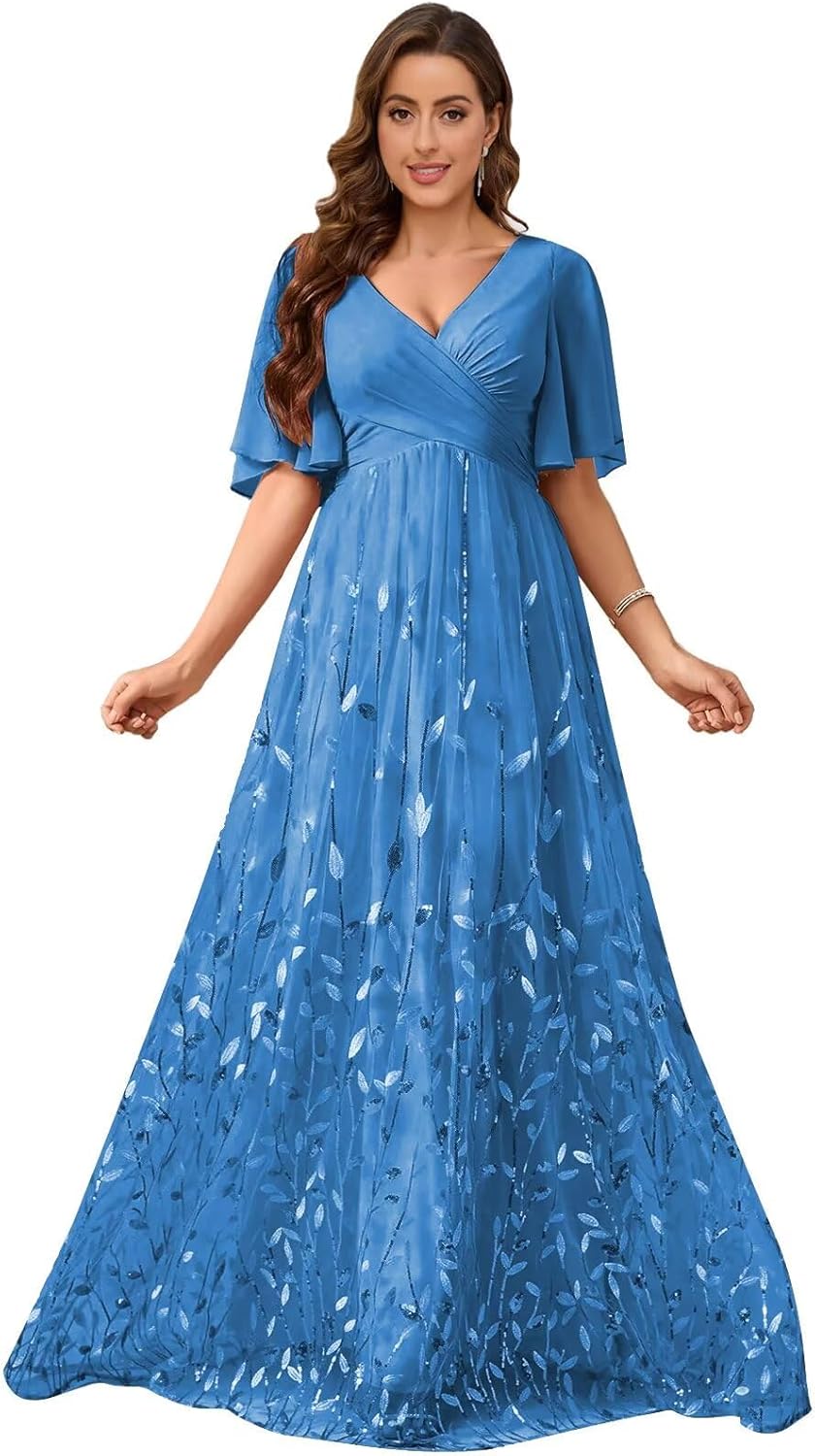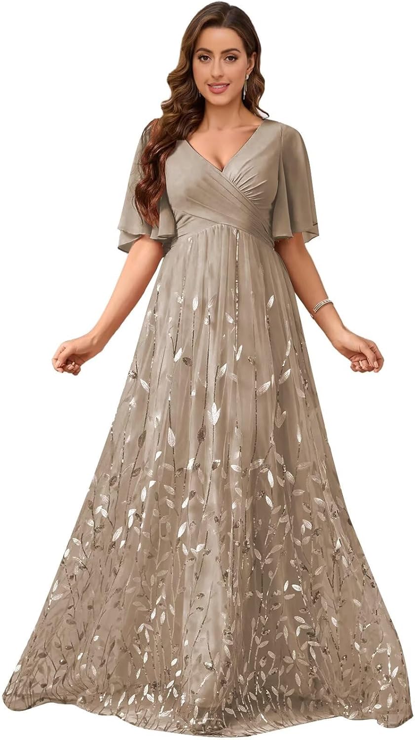 MOTHER OF THE BRIDE DRESSES FOR WEDDING One of the most requested items we see is for Mother of The Bride Dresses! Our shop will show you the formal evening Dresses with 3/4 or Short Sleeve for mother any color or for any season! Mother of The Bride Dresses for Women Leaf Sequin Tulle Floor Length Chiffon Wedding Guest Dress Evening Party Gowns Fabric: Chiffon Embellishment: Lace Silhouette: A-LineLength: Floor Length Neckline: V NeckStraps & Sleeves:Short Ruffles Sleeves Mother of the groom dress for wedding, Mother of the Bride Dresses for Wedding,Dress for mother of the bride, Mother of the bride long dress, Mother of the bride dresses lace applique chiffon, Mother of the bride dress plus size, Formal gowns and evening dresses, Prom dress for women, Grandmother dresses with sleeves, Mother of the groom dresses for fall wedding, Mother of the bride dresses beach wedding, Women's Formal Dresses. FeaturesMother of The Bride Dresses:This elegant mother of the bride dress is made of high quality soft chiffon fabric with tulle leaf sequin,lightweight and flattering to the skin. Features a flattering a-line silhouette and classic v neck design. The zipper back provides a customizable fit, and the floor-length hem enhances gracefulness. With a built-in bra for support, this mother of the groom dress combines comfort and style, making it perfect for weddings and special occasions.