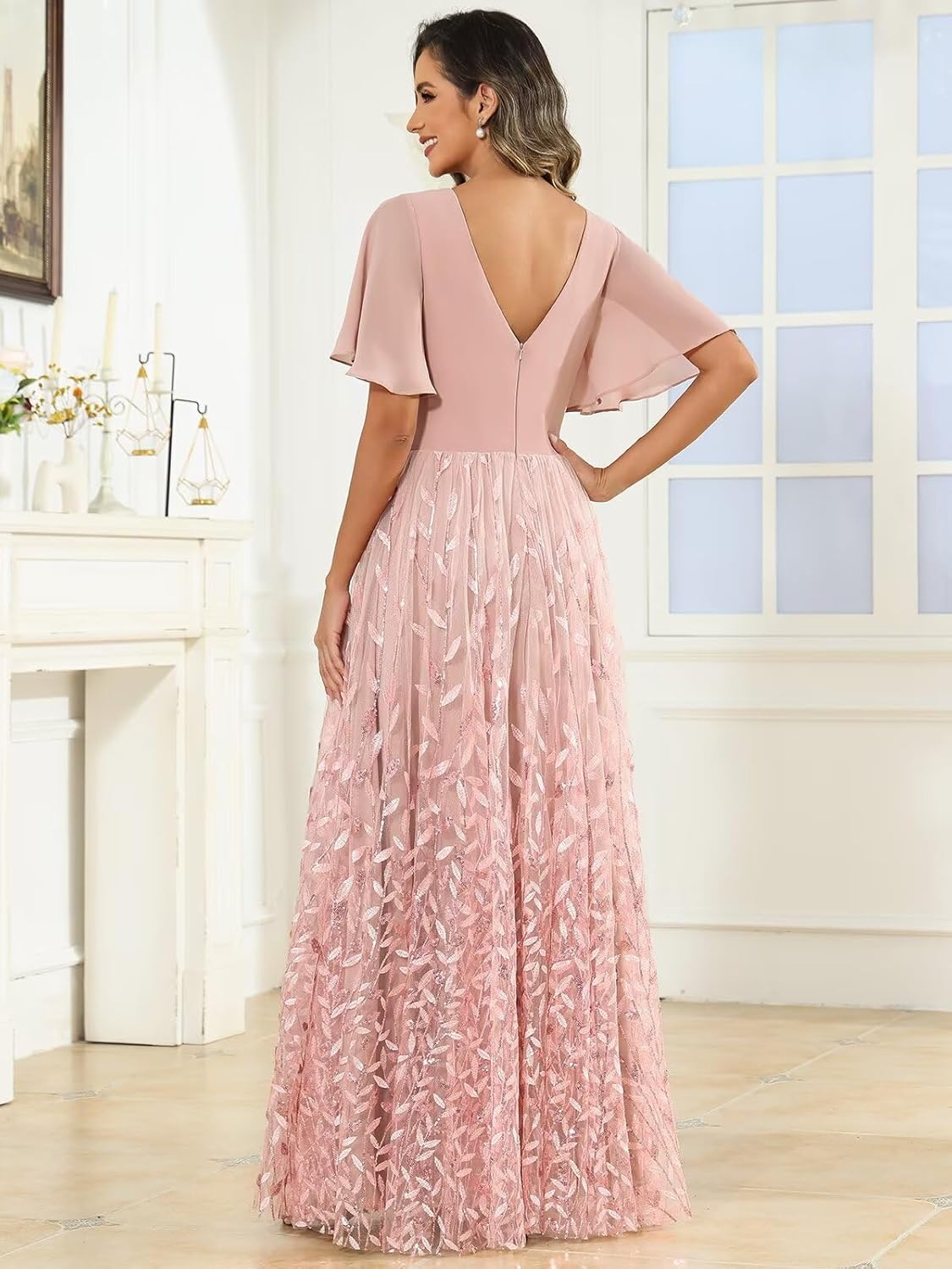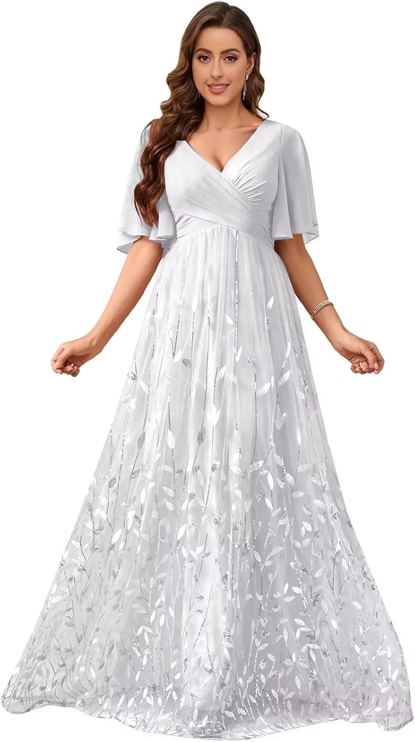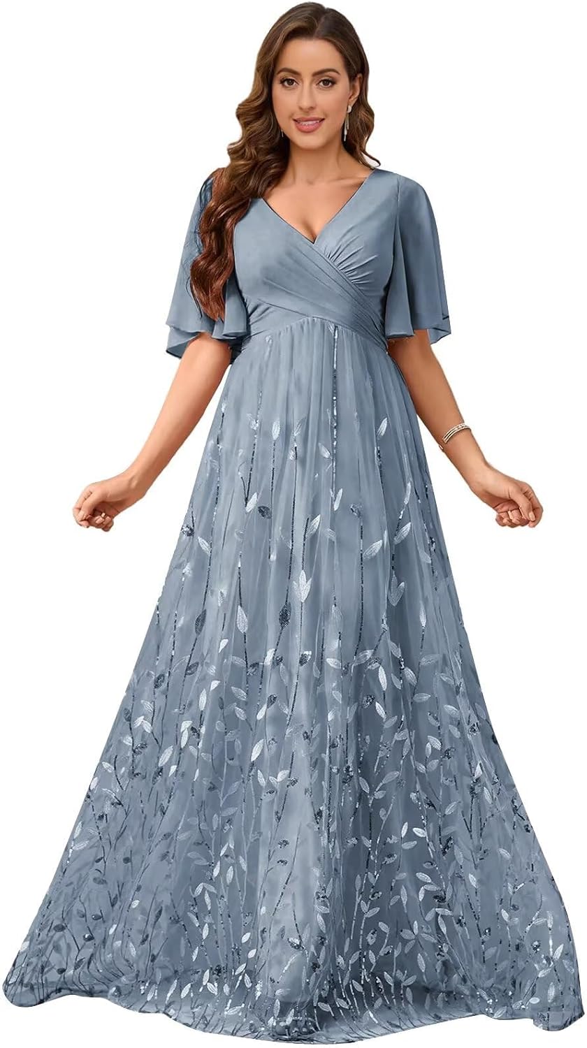 MOTHER OF THE BRIDE DRESSES FOR WEDDING One of the most requested items we see is for Mother of The Bride Dresses! Our shop will show you the formal evening Dresses with 3/4 or Short Sleeve for mother any color or for any season! Mother of The Bride Dresses for Women Leaf Sequin Tulle Floor Length Chiffon Wedding Guest Dress Evening Party Gowns Fabric: Chiffon Embellishment: Lace Silhouette: A-LineLength: Floor Length Neckline: V NeckStraps & Sleeves:Short Ruffles Sleeves Mother of the groom dress for wedding, Mother of the Bride Dresses for Wedding,Dress for mother of the bride, Mother of the bride long dress, Mother of the bride dresses lace applique chiffon, Mother of the bride dress plus size, Formal gowns and evening dresses, Prom dress for women, Grandmother dresses with sleeves, Mother of the groom dresses for fall wedding, Mother of the bride dresses beach wedding, Women's Formal Dresses. FeaturesMother of The Bride Dresses:This elegant mother of the bride dress is made of high quality soft chiffon fabric with tulle leaf sequin,lightweight and flattering to the skin. Features a flattering a-line silhouette and classic v neck design. The zipper back provides a customizable fit, and the floor-length hem enhances gracefulness. With a built-in bra for support, this mother of the groom dress combines comfort and style, making it perfect for weddings and special occasions.