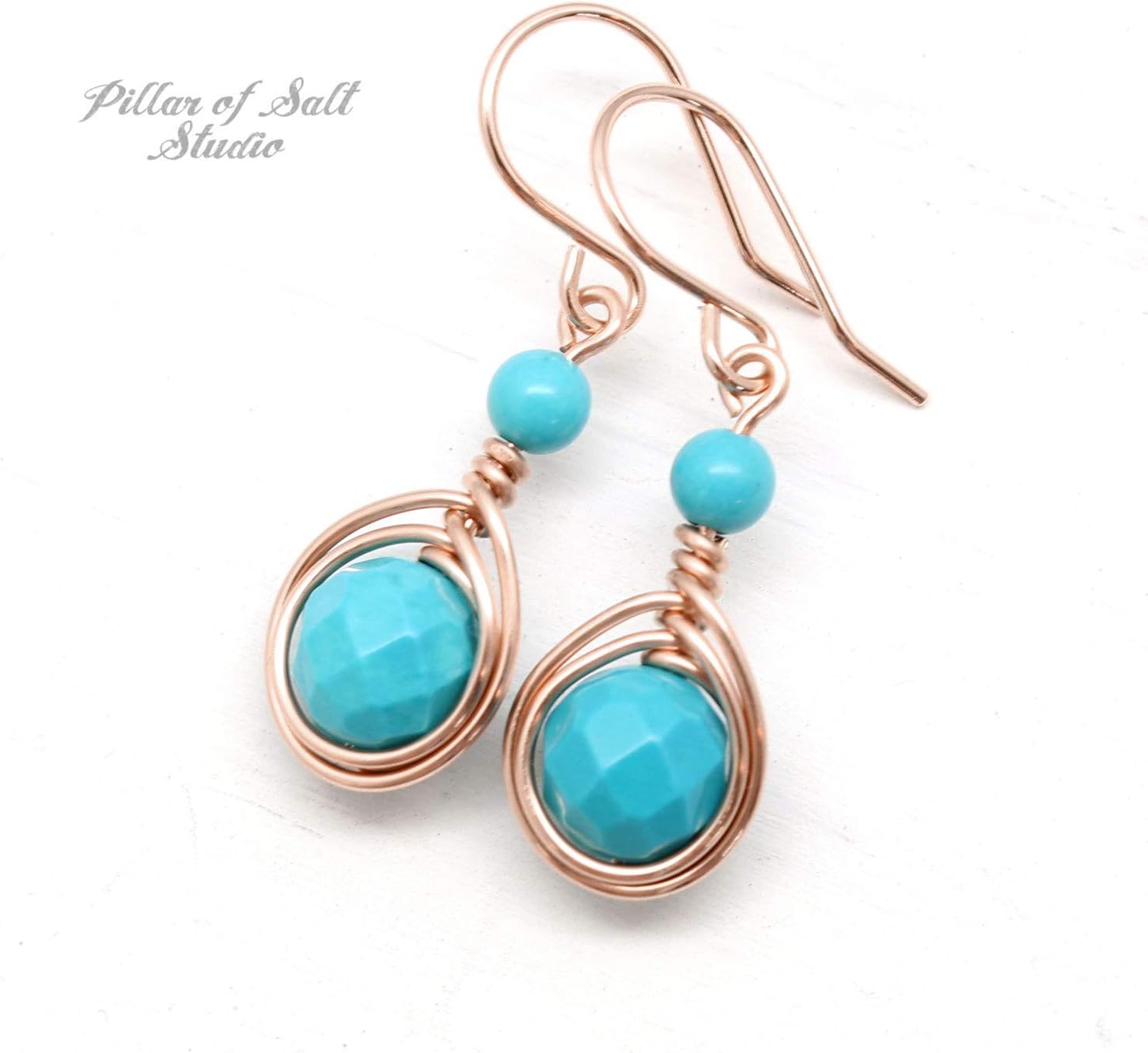 Rose Gold and Turquoise make a gorgeous pairing. These earrings are handmade by wrapping 14k (14/20) rose gold-filled wire around genuine Turquoise stones. Lightweight.