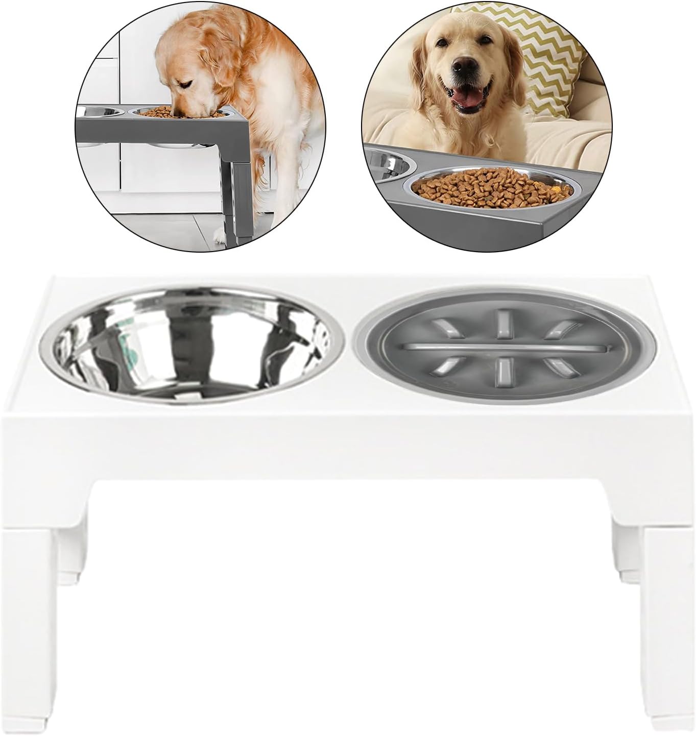 Raised Pet Double Bowl Adjustable Slow Feeder Bowl Small Dog Bowl Kitten Food Bowl Water Dispenser Watering SuppliesFeatures:Adjustable double bowl feeder for your pets feeding needs.Slow feed designed helps pets from eating too quickly, promoting better digestion.Suitable for pet owners, especially those with multiple pets.Versatile for use in homes, pet stores, and pet carefacilities, as well as for daily feeding, travel, and outings.Crafted with and easy to materials for long lasting use.Specifications:ABS, 304 Stainless SteelProduct Size: Approx. 44x27.9x29cm 17.32x10.98x11.41inch Option: Gray/White/BlackPackage Includes:1x Raised Pet BowlNote:Please allow 1-2cm errors due to manual measurement. Due to the difference between different monitors, the picture may not reflect the actual color of the item.