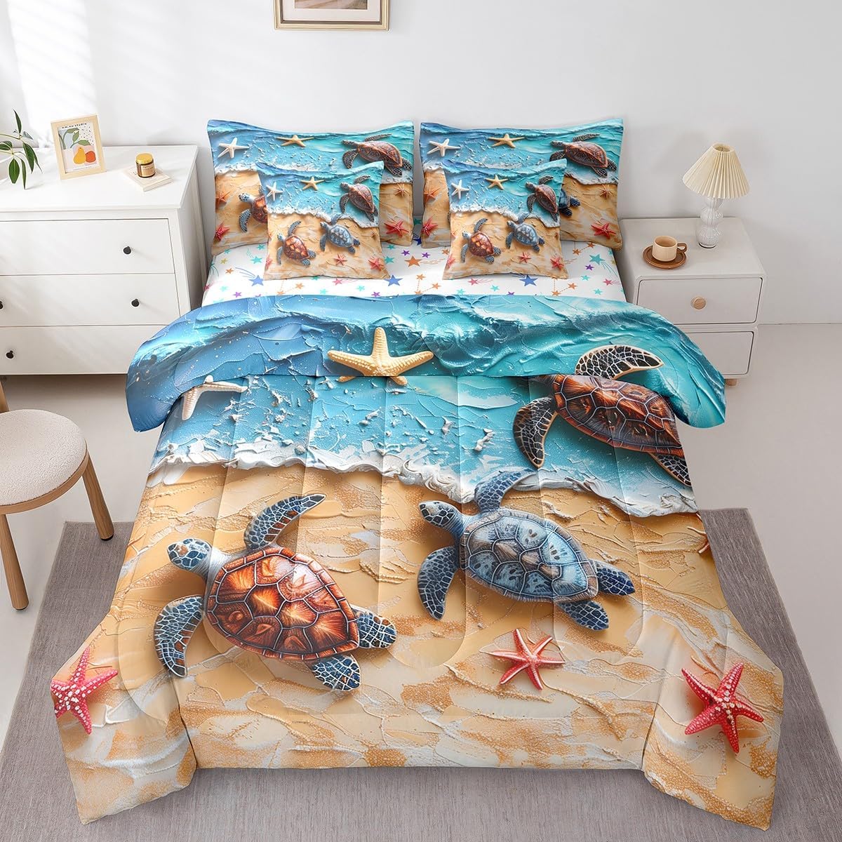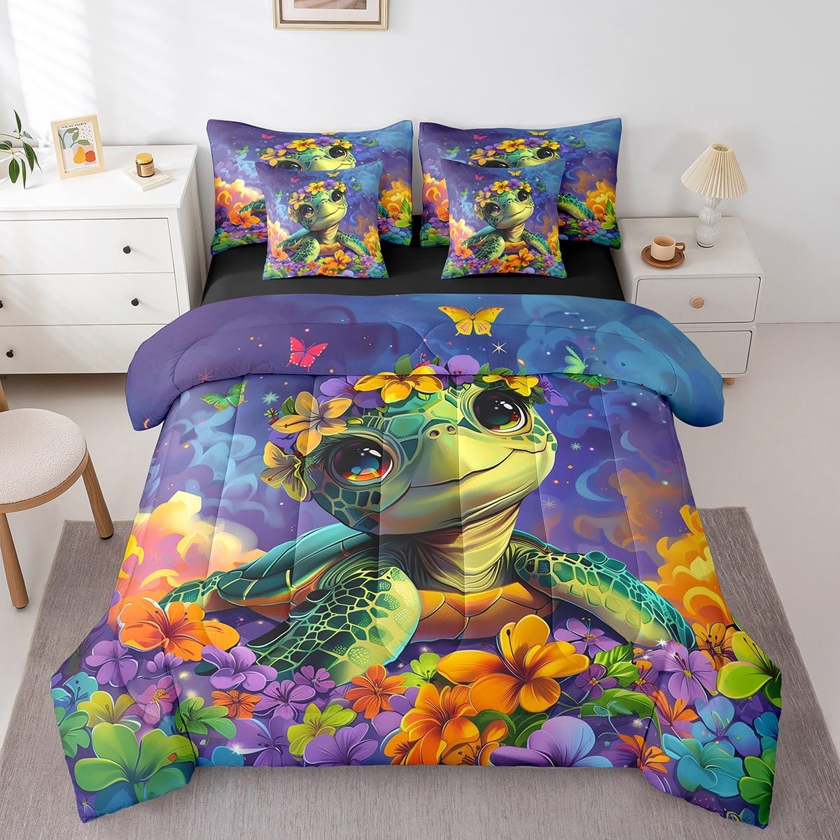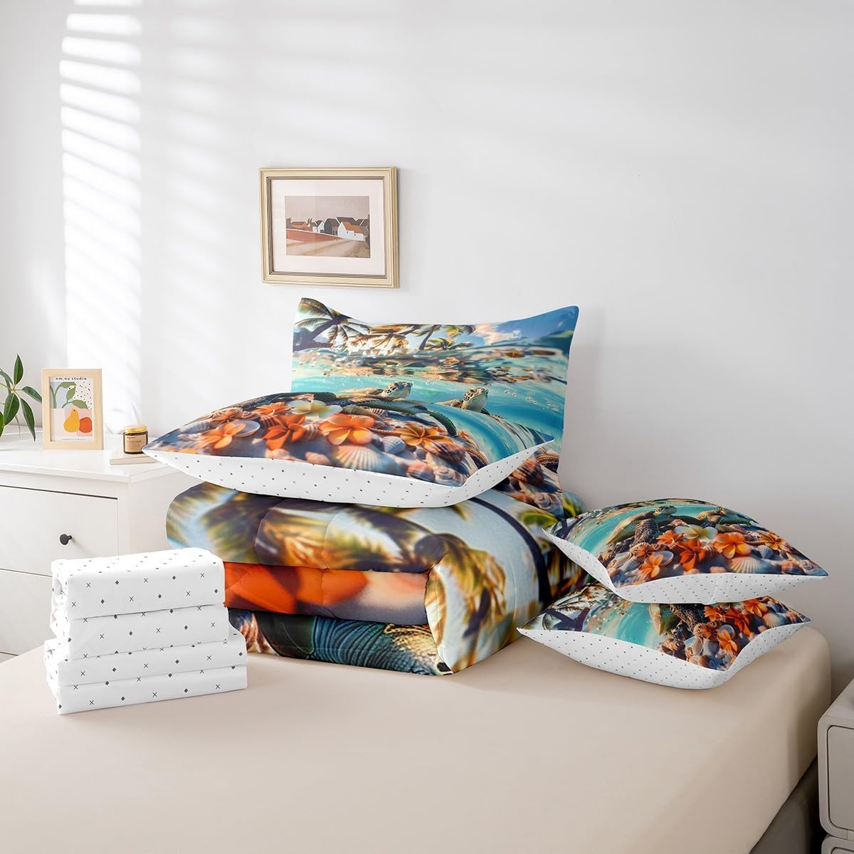 Welcome to our store. We have specialized in home textile for many years. We are contribute to provide the best customer service and products. We'll try our best to answer your questions and solve your problems. Size information: Twin size: 1 Down Comforter 68"W x 90"L, 1 Fitted Sheet 39"W x 75"L x 16"H, 1 Flat Sheet 67"W x 96"L, 2 Pillowcases 20" x 30", 2 Throw Pillow Covers 18" x 18" Full size: 1 Down Comforter 79"W x 90"L, 1 Fitted Sheet 55"W x 75"L x 16"H, 1 Flat Sheet 81"W x 96"L, 2 Pillowcases 20" x 30", 2 Throw Pillow Covers 18" x 18" Queen size: 1 Down Comforter 90"W x 90"L, 1 Fitted Sheet 60"W x 80"L x 16"H, 1 Flat Sheet 90"W x 102"L, 2 Pillowcases 20" x 30", 2 Throw Pillow Covers 18" x 18" King size: 1 Down Comforter 104"W x 90"L, 1 Fitted Sheet 78"W x 80"L x 16"H, 1 Flat Sheet 90"W x 106"L, 2 Pillowcases 20" x 36", 2 Throw Pillow Covers 18" x 18" Useful and practical: A luxurious product for homes,dorm rooms,hotels,guest rooms. Practical to use for being polyester, feels like cotton which is super soft and breathable. No chemicals used, no dye substance harming the health of you or your family. Unique design: Vivid Colors won't fade thanks to new 3D digital printing methods. These unique designs match well with various color palettes of your rugs, curtains, headboard, furniture, and all other decor accessories. Washing instructions: Machine wash separately in cold water,hang dry, do not bleach.