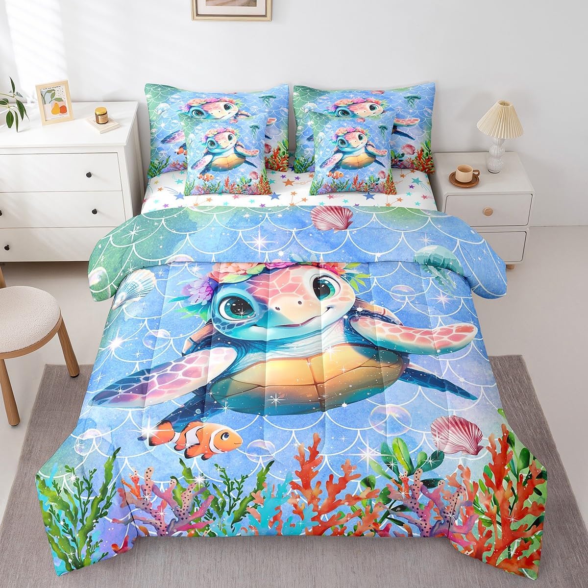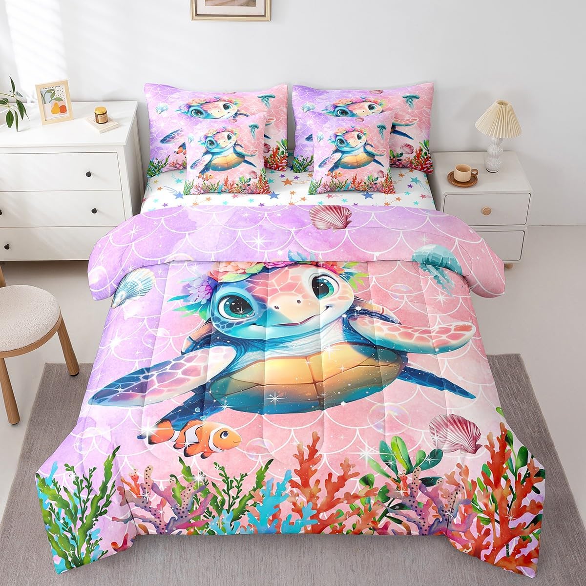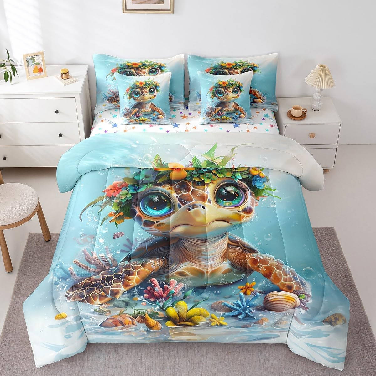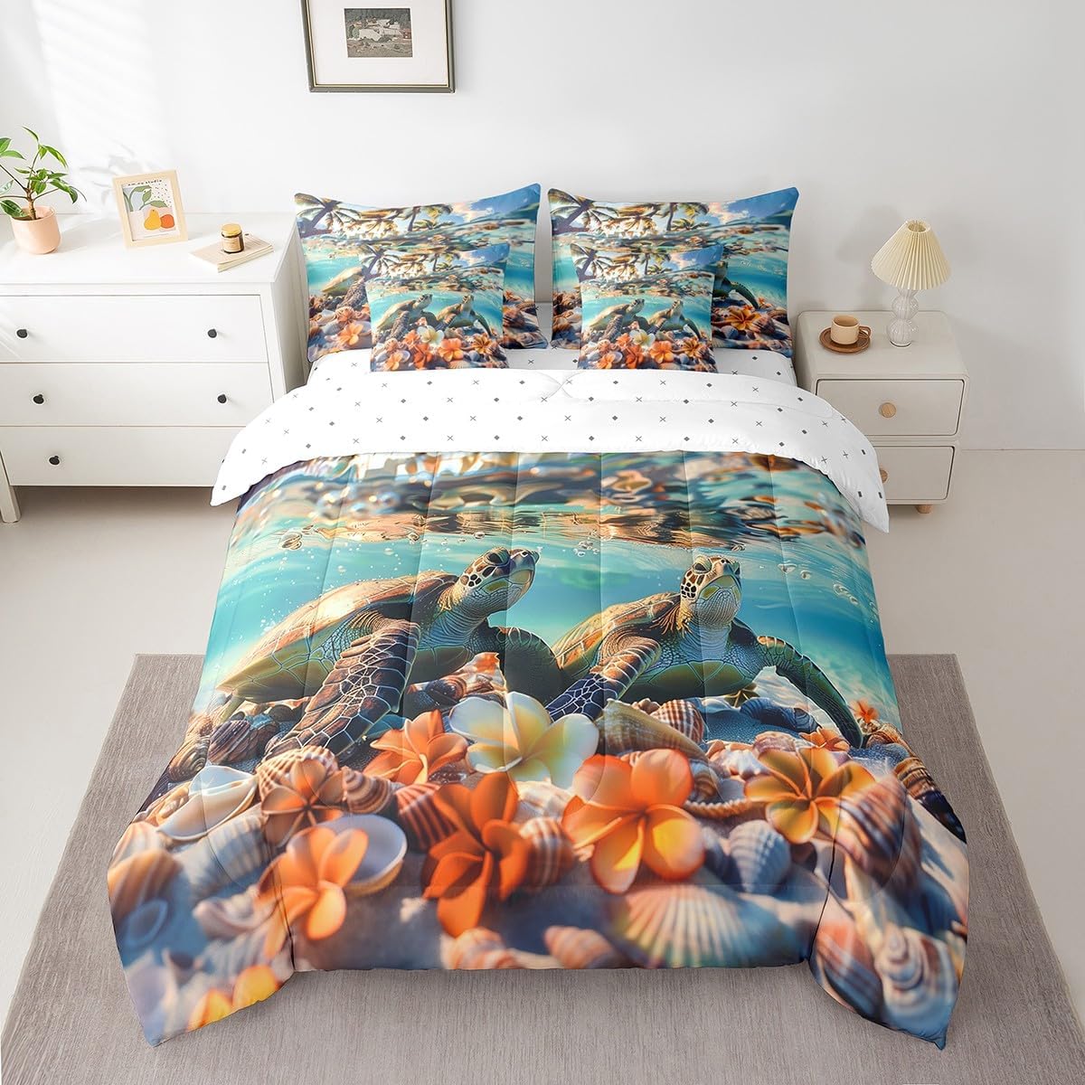 Welcome to our store. We have specialized in home textile for many years. We are contribute to provide the best customer service and products. We'll try our best to answer your questions and solve your problems. Size information: Twin size: 1 Down Comforter 68"W x 90"L, 1 Fitted Sheet 39"W x 75"L x 16"H, 1 Flat Sheet 67"W x 96"L, 2 Pillowcases 20" x 30", 2 Throw Pillow Covers 18" x 18" Full size: 1 Down Comforter 79"W x 90"L, 1 Fitted Sheet 55"W x 75"L x 16"H, 1 Flat Sheet 81"W x 96"L, 2 Pillowcases 20" x 30", 2 Throw Pillow Covers 18" x 18" Queen size: 1 Down Comforter 90"W x 90"L, 1 Fitted Sheet 60"W x 80"L x 16"H, 1 Flat Sheet 90"W x 102"L, 2 Pillowcases 20" x 30", 2 Throw Pillow Covers 18" x 18" King size: 1 Down Comforter 104"W x 90"L, 1 Fitted Sheet 78"W x 80"L x 16"H, 1 Flat Sheet 90"W x 106"L, 2 Pillowcases 20" x 36", 2 Throw Pillow Covers 18" x 18" Useful and practical: A luxurious product for homes,dorm rooms,hotels,guest rooms. Practical to use for being polyester, feels like cotton which is super soft and breathable. No chemicals used, no dye substance harming the health of you or your family. Unique design: Vivid Colors won't fade thanks to new 3D digital printing methods. These unique designs match well with various color palettes of your rugs, curtains, headboard, furniture, and all other decor accessories. Washing instructions: Machine wash separately in cold water,hang dry, do not bleach.