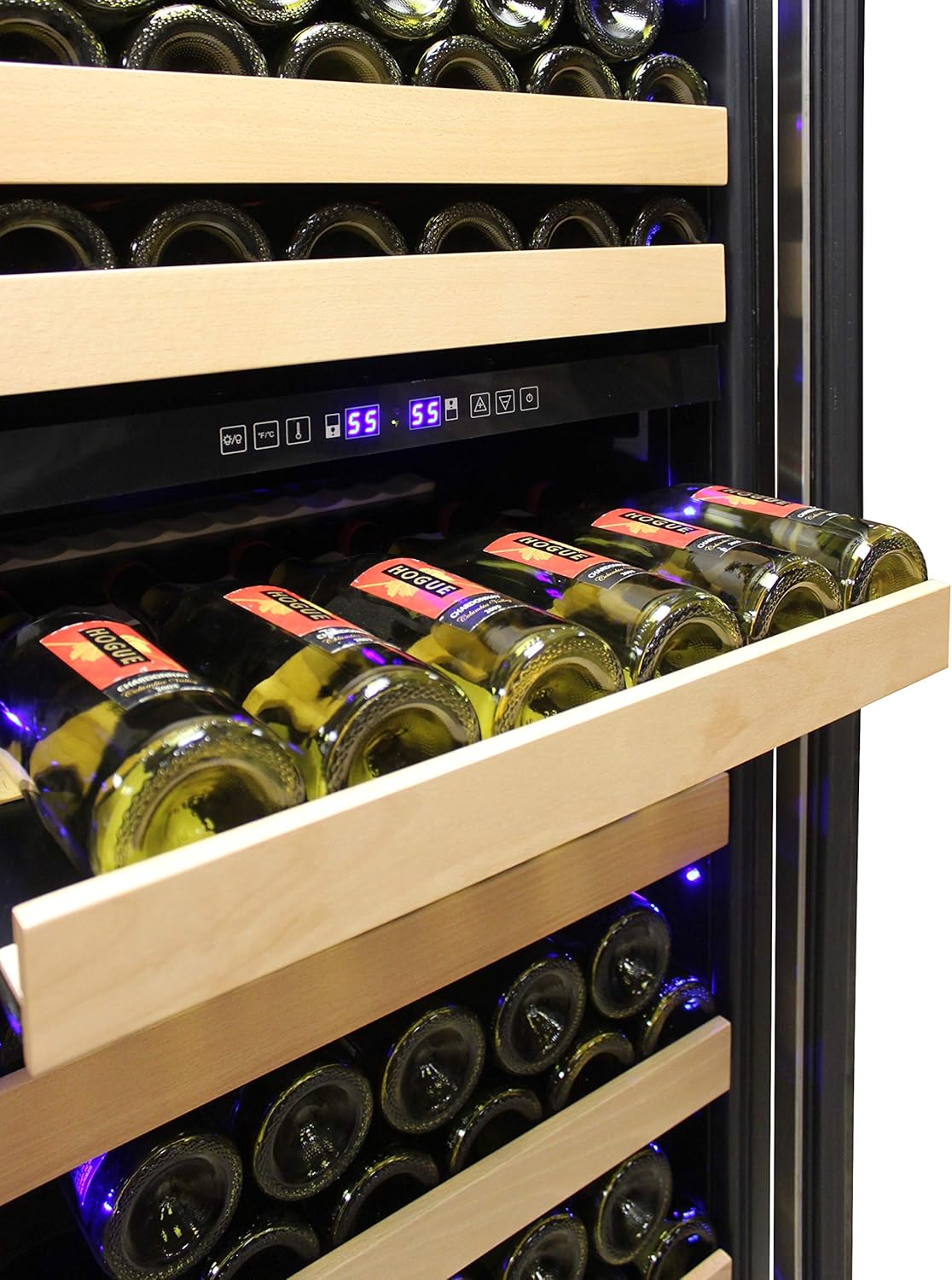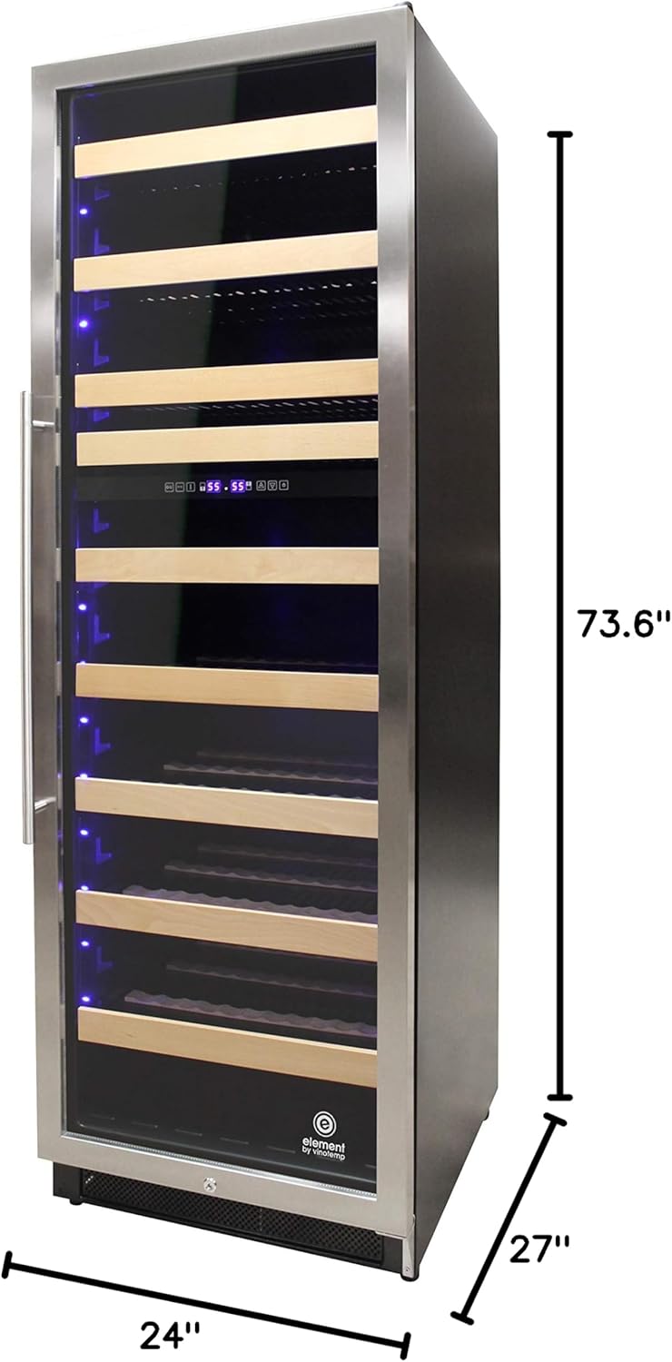 Elevate your wine collection with the Vinotemp 215 Bottle Wine Cooler Refrigerator, a pinnacle of luxury and innovation. A must-have for avid wine enthusiasts, this Connoisseur Series wine cooler offers impeccable dual zone storage capabilities for reds and whites. Boasting a vast 119-215 bottle capacity, this wine refrigerator is a haven for your cherished reds, whites, and sparklings. The specialty designed wire shelves, complete with wood lips and grooves, securely cradle each bottle, while this right-hinge fridge seamlessly integrates into your space. The sleek dual-pane glass door, adorned with a stainless steel handle and set against a black body, adds a touch of elegance to any setting. Customize your wine sanctuary with the dual zone temperature control, allowing you to store wines at their optimal conditions. The upper zone maintains temperatures from 40°F to 56°F, perfect for whites and sparkling, while the lower zone accommodates whites within the range of 54°F to 65°F perfect for reds. The centralized digital control panel ensures precision, even in ambient temperatures between 41°F to 100°F. Immerse yourself in practical luxury with the Vinotemp 215 Bottle Wine Cooler's array of features. Adjustable specialty shelves, meticulously crafted with grooves for secure bottle placement, ensure easy access. For unconventional shapes and additional storage, a dedicated bulk storage area is thoughtfully included. Installation is effortless with front exhaust options for both built-in and freestanding applications. Compact dimensions of 24"W x 27"D x 73.6"H ensure seamless integration into your space. The wine cooler's vibration-damping design safeguards your collection, while its commitment to low energy consumption and minimal noise creates a serene storage environment. Experience the Connoisseur Series, where contemporary design meets innovation. The Vinotemp 215 Bottle Wine Cooler stands as a testament to modern elegance, featuring stainless steel wine racks paired with wooden racking.